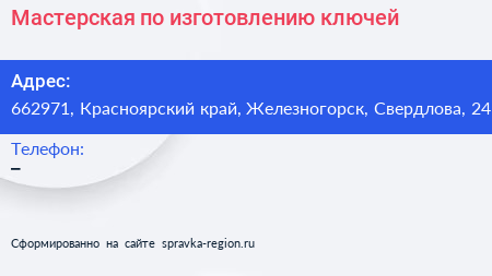 Мастерская по изготовлению ключей по адресу 662971, Красноярский край, Железногорск, Свердлова, 24 в дальнейшем Организация, размещена в следующих категориях: