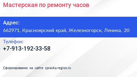 Мастерская по ремонту часов по адресу 662971, Красноярский край, Железногорск, Ленина, 20 в дальнейшем Организация, размещена в следующих категориях: