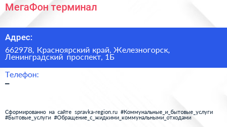 МегаФон, терминал по адресу 662978, Красноярский край, Железногорск, Ленинградский проспект, 1Б в дальнейшем Организация, размещена в следующих категориях: