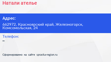Натали, ателье по адресу 662972, Красноярский край, Железногорск, Комсомольская, 24 в дальнейшем Организация, размещена в следующих категориях: