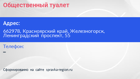 Общественный туалет по адресу 662978, Красноярский край, Железногорск, Ленинградский проспект, 55 в дальнейшем Организация, размещена в следующих категориях: