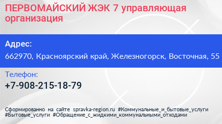 ПЕРВОМАЙСКИЙ ЖЭК-7, управляющая организация по адресу 662970, Красноярский край, Железногорск, Восточная, 55 в дальнейшем Организация, размещена в следующих категориях: