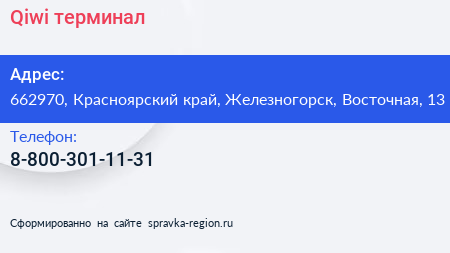 Qiwi, терминал по адресу 662970, Красноярский край, Железногорск, Восточная, 13 в дальнейшем Организация, размещена в следующих категориях: