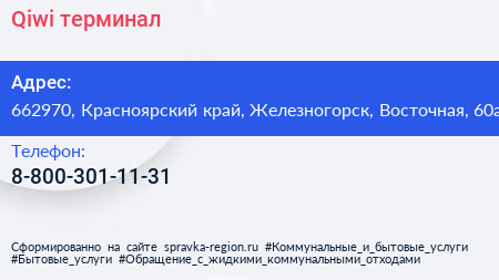 Qiwi, терминал по адресу 662970, Красноярский край, Железногорск, Восточная, 60а в дальнейшем Организация, размещена в следующих категориях: