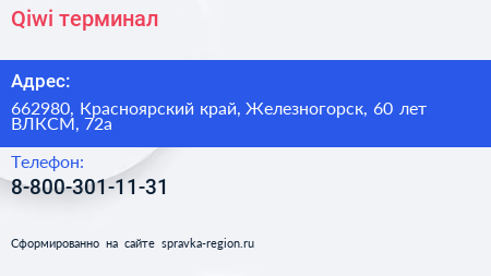 Qiwi, терминал по адресу 662980, Красноярский край, Железногорск, 60 лет ВЛКСМ, 72а в дальнейшем Организация, размещена в следующих категориях: