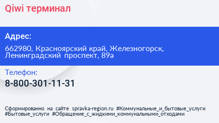 Qiwi, терминал по адресу 662980, Красноярский край, Железногорск, Ленинградский проспект, 89а в дальнейшем Организация, размещена в следующих категориях: