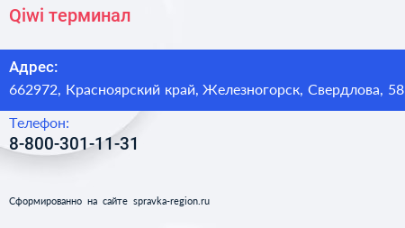 Qiwi, терминал по адресу 662972, Красноярский край, Железногорск, Свердлова, 58 в дальнейшем Организация, размещена в следующих категориях: