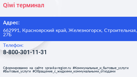 Qiwi, терминал по адресу 662991, Красноярский край, Железногорск, Строительная, 27Б в дальнейшем Организация, размещена в следующих категориях: