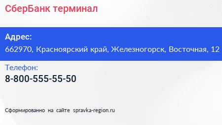 СберБанк, терминал по адресу 662970, Красноярский край, Железногорск, Восточная, 12 в дальнейшем Организация, размещена в следующих категориях: