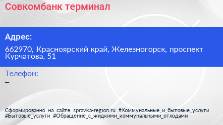 Совкомбанк, терминал по адресу 662970, Красноярский край, Железногорск, проспект Курчатова, 51 в дальнейшем Организация, размещена в следующих категориях: