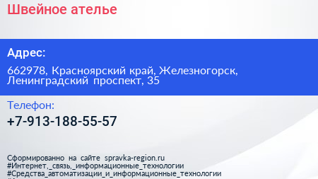 Швейное ателье по адресу 662978, Красноярский край, Железногорск, Ленинградский проспект, 35 в дальнейшем Организация, размещена в следующих категориях: