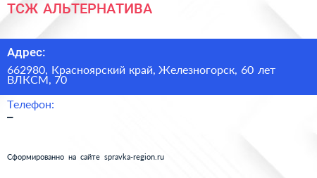 ТСЖ АЛЬТЕРНАТИВА по адресу 662980, Красноярский край, Железногорск, 60 лет ВЛКСМ, 70 в дальнейшем Организация, размещена в следующих категориях: