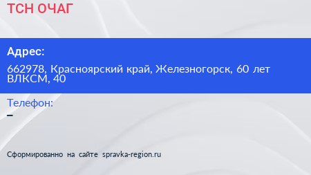 ТСН ОЧАГ по адресу 662978, Красноярский край, Железногорск, 60 лет ВЛКСМ, 40 в дальнейшем Организация, размещена в следующих категориях: