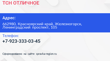 ТСН ОТЛИЧНОЕ по адресу 662980, Красноярский край, Железногорск, Ленинградский проспект, 105 в дальнейшем Организация, размещена в следующих категориях: