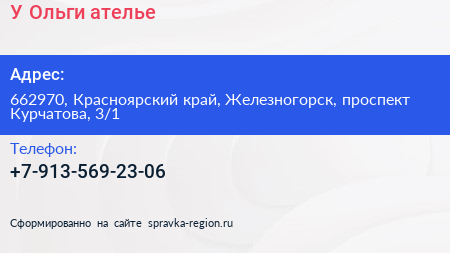 У Ольги, ателье по адресу 662970, Красноярский край, Железногорск, проспект Курчатова, 3/1 в дальнейшем Организация, размещена в следующих категориях: