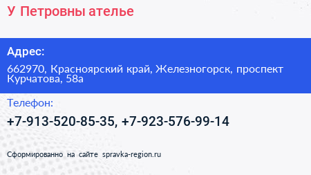 У Петровны, ателье по адресу 662970, Красноярский край, Железногорск, проспект Курчатова, 58а в дальнейшем Организация, размещена в следующих категориях: