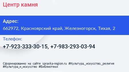 Центр камня по адресу 662972, Красноярский край, Железногорск, Тихая, 2 в дальнейшем Организация, размещена в следующих категориях: