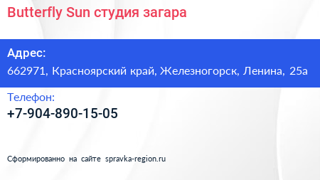 Butterfly Sun, студия загара по адресу 662971, Красноярский край, Железногорск, Ленина, 25а в дальнейшем Организация, размещена в следующих категориях: