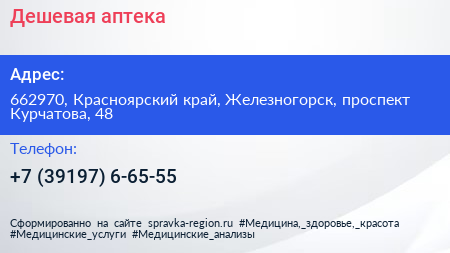 Дешевая аптека по адресу 662970, Красноярский край, Железногорск, проспект Курчатова, 48 в дальнейшем Организация, размещена в следующих категориях: