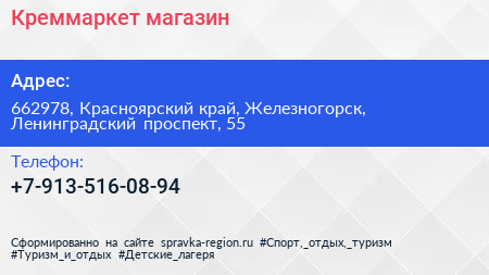 Креммаркет, магазин по адресу 662978, Красноярский край, Железногорск, Ленинградский проспект, 55 в дальнейшем Организация, размещена в следующих категориях: