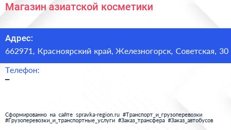 Магазин азиатской косметики по адресу 662971, Красноярский край, Железногорск, Советская, 30 в дальнейшем Организация, размещена в следующих категориях: