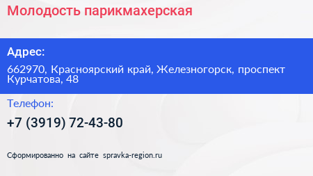 Молодость, парикмахерская по адресу 662970, Красноярский край, Железногорск, проспект Курчатова, 48 в дальнейшем Организация, размещена в следующих категориях:
