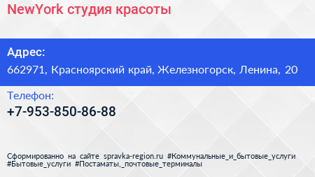 NewYork, студия красоты по адресу 662971, Красноярский край, Железногорск, Ленина, 20 в дальнейшем Организация, размещена в следующих категориях: