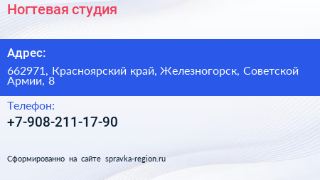 Ногтевая студия по адресу 662971, Красноярский край, Железногорск, Советской Армии, 8 в дальнейшем Организация, размещена в следующих категориях:
