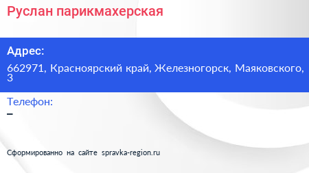 Руслан, парикмахерская по адресу 662971, Красноярский край, Железногорск, Маяковского, 3 в дальнейшем Организация, размещена в следующих категориях: