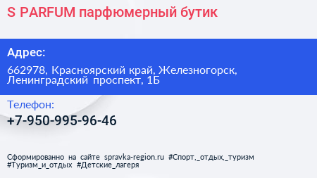 S PARFUM, парфюмерный бутик по адресу 662978, Красноярский край, Железногорск, Ленинградский проспект, 1Б в дальнейшем Организация, размещена в следующих категориях: