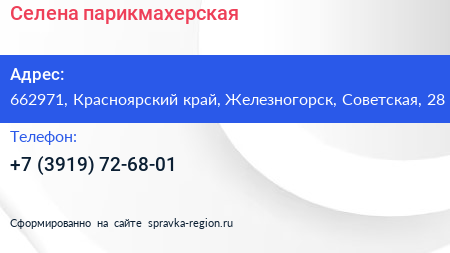 Селена, парикмахерская по адресу 662971, Красноярский край, Железногорск, Советская, 28 в дальнейшем Организация, размещена в следующих категориях: