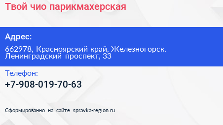 Твой чио, парикмахерская по адресу 662978, Красноярский край, Железногорск, Ленинградский проспект, 33 в дальнейшем Организация, размещена в следующих категориях:
