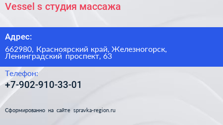 Vessel’s, студия массажа по адресу 662980, Красноярский край, Железногорск, Ленинградский проспект, 63 в дальнейшем Организация, размещена в следующих категориях:
