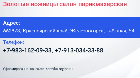Золотые ножницы, салон-парикмахерская по адресу 662973, Красноярский край, Железногорск, Таёжная, 54 в дальнейшем Организация, размещена в следующих категориях: