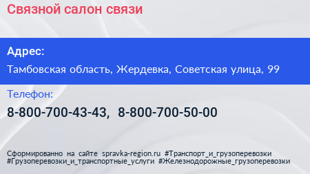Связной, салон связи по адресу Тамбовская область, Жердевка, Советская улица, 99 в дальнейшем Организация, размещена в следующих категориях: