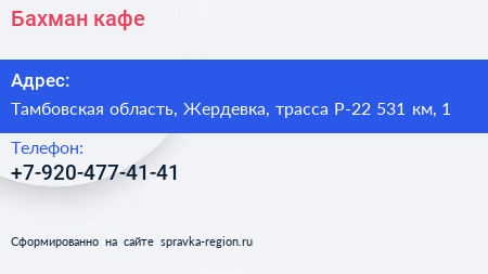 Бахман, кафе по адресу Тамбовская область, Жердевка, трасса Р-22 531 км, 1 в дальнейшем Организация, размещена в следующих категориях: