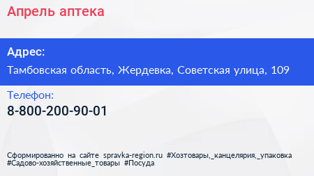 Апрель, аптека по адресу Тамбовская область, Жердевка, Советская улица, 109 в дальнейшем Организация, размещена в следующих категориях:
