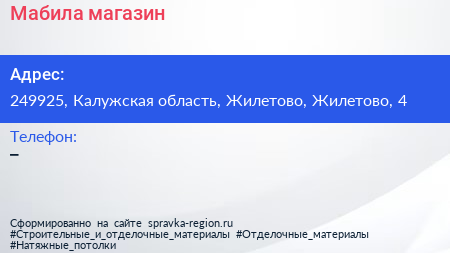 Мабила, магазин по адресу 249925, Калужская область, Жилетово, Жилетово, 4 в дальнейшем Организация, размещена в следующих категориях: