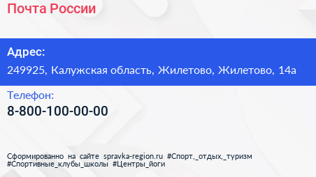 Почта России по адресу 249925, Калужская область, Жилетово, Жилетово, 14а в дальнейшем Организация, размещена в следующих категориях: