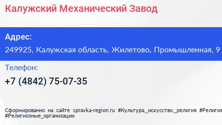 Калужский Механический Завод по адресу 249925, Калужская область, Жилетово, Промышленная, 9 в дальнейшем Организация, размещена в следующих категориях: