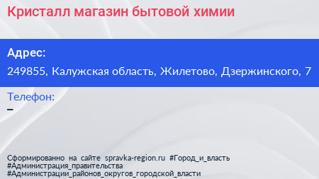 Кристалл, магазин бытовой химии по адресу 249855, Калужская область, Жилетово, Дзержинского, 7 в дальнейшем Организация, размещена в следующих категориях: