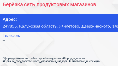 Берёзка, сеть продуктовых магазинов по адресу 249855, Калужская область, Жилетово, Дзержинского, 14а в дальнейшем Организация, размещена в следующих категориях: