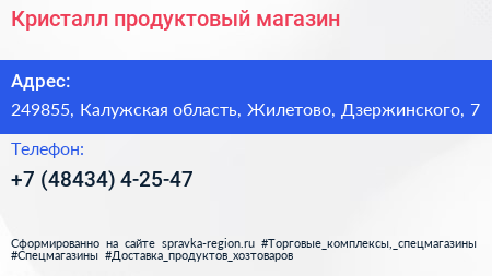 Кристалл, продуктовый магазин по адресу 249855, Калужская область, Жилетово, Дзержинского, 7 в дальнейшем Организация, размещена в следующих категориях: