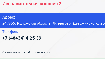 Исправительная колония №2 по адресу 249855, Калужская область, Жилетово, Дзержинского, 2Б в дальнейшем Организация, размещена в следующих категориях: