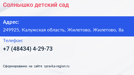 Солнышко, детский сад по адресу 249925, Калужская область, Жилетово, Жилетово, 8а в дальнейшем Организация, размещена в следующих категориях:
