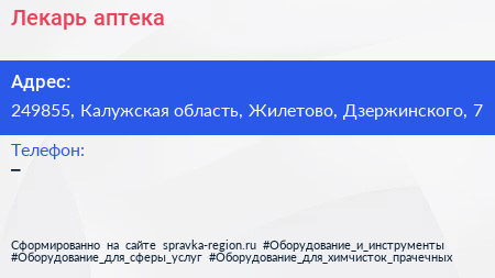 Лекарь, аптека по адресу 249855, Калужская область, Жилетово, Дзержинского, 7 в дальнейшем Организация, размещена в следующих категориях: