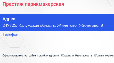 Престиж, парикмахерская по адресу 249925, Калужская область, Жилетово, Жилетово, 8 в дальнейшем Организация, размещена в следующих категориях: