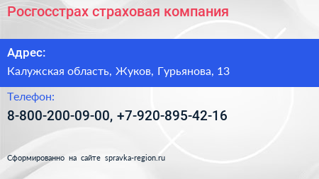 Росгосстрах, страховая компания по адресу Калужская область, Жуков, Гурьянова, 13 в дальнейшем Организация, размещена в следующих категориях: