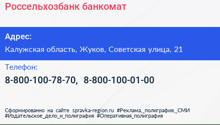 Россельхозбанк, банкомат по адресу Калужская область, Жуков, Советская улица, 21 в дальнейшем Организация, размещена в следующих категориях: