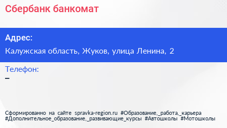 Сбербанк, банкомат по адресу Калужская область, Жуков, улица Ленина, 2 в дальнейшем Организация, размещена в следующих категориях: